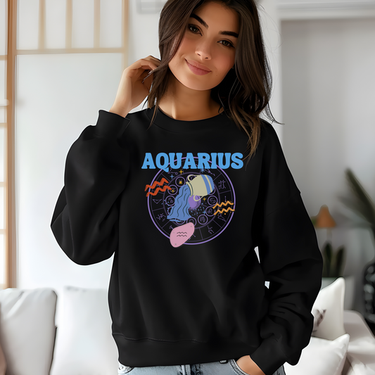 • White Aquarius sweatshirt with colorful Aquarius symbol, zodiac wheel, and bold 'Aquarius' text.
