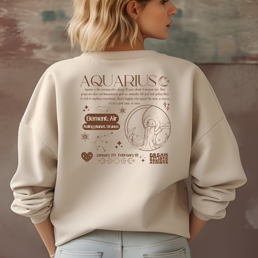 • White Aquarius sweatshirt with brown Aquarius symbol, celestial decorations, and zodiac elements.