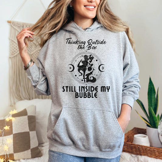 • White sweatshirt with 'Thinking Outside the Box, Still Inside My Bubble' text and black celestial-themed illustration.