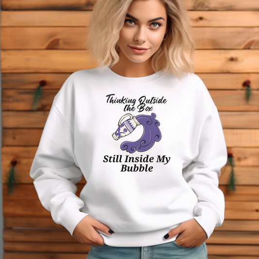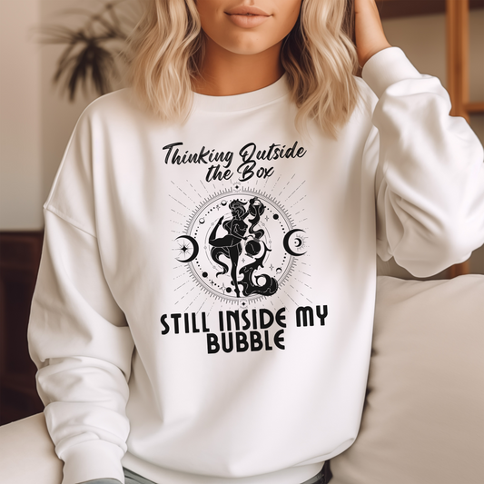 • White sweatshirt with 'Thinking Outside the Box, Still Inside My Bubble' text and purple Aquarius-themed illustration.